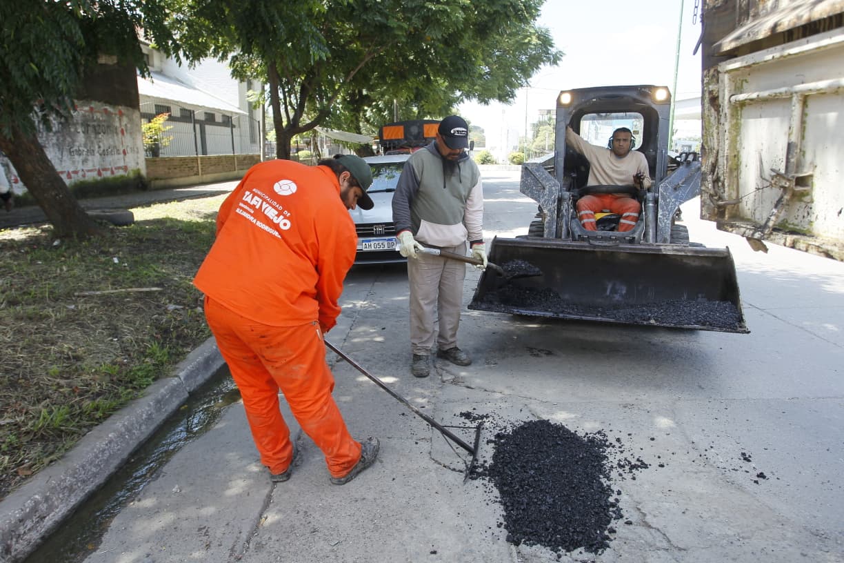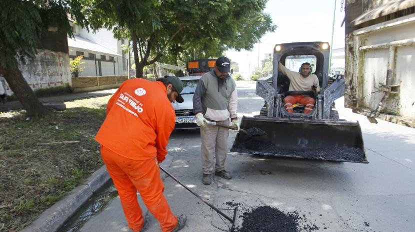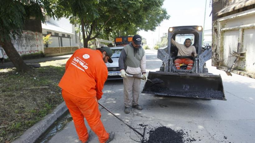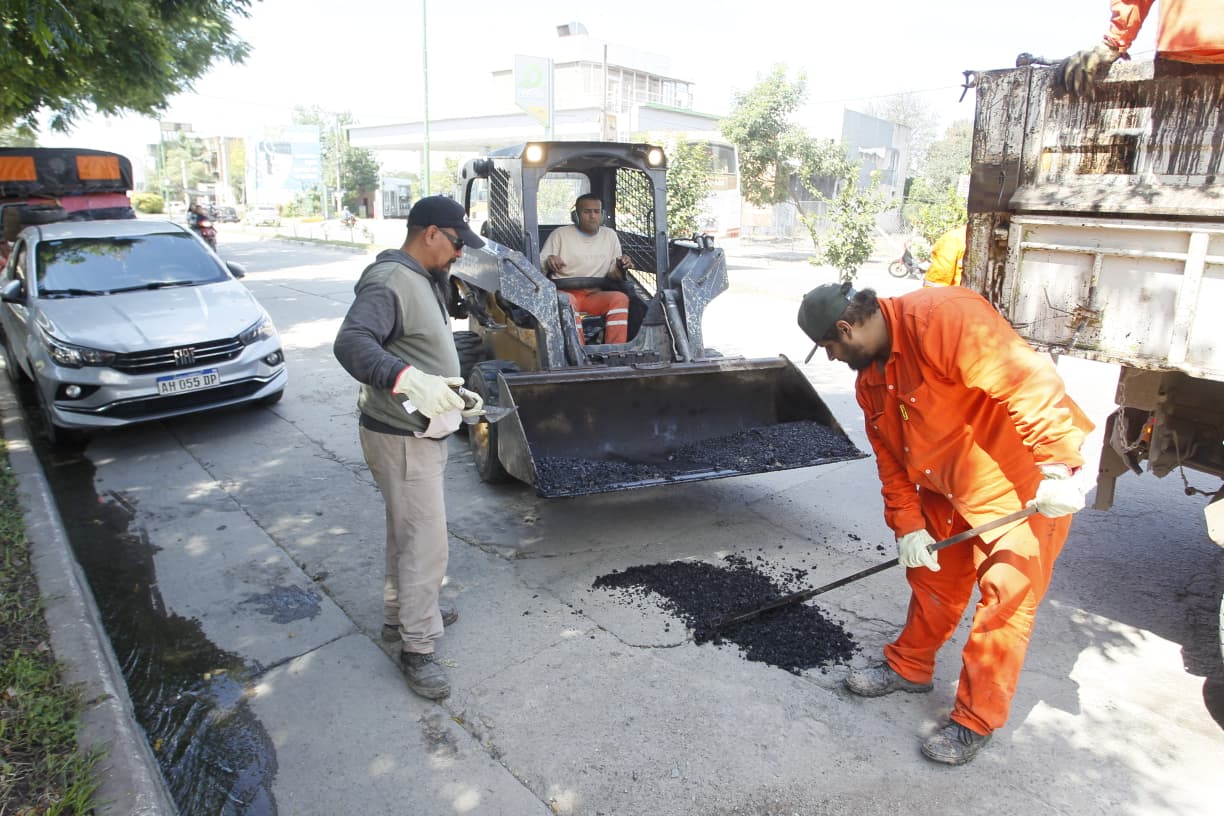 En el marco del plan integral de mantenimiento urbano, operarios realizan tareas de bacheo en distintas arterias de la ciudad para mejorar el estado de calles y avenidas.