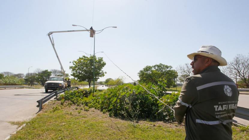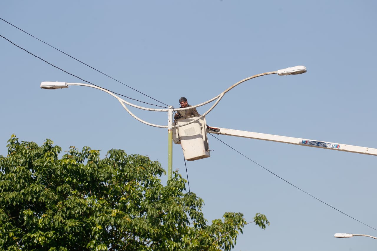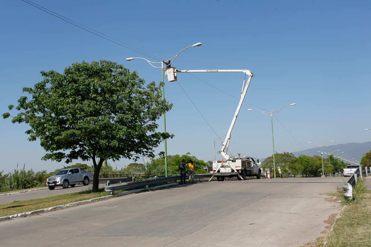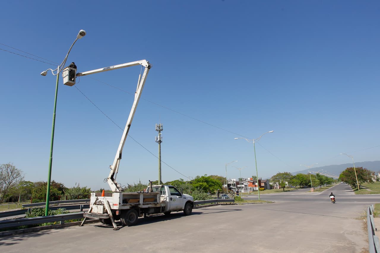 Con el objetivo de reforzar la seguridad y brindar un mejor servicio eléctrico se realizan trabajos en la avenida Alfonsín, en la zona del puente de Lomas de Tafí. Las tareas incluyen la reposición de cable y la instalación de nuevas luces LED.