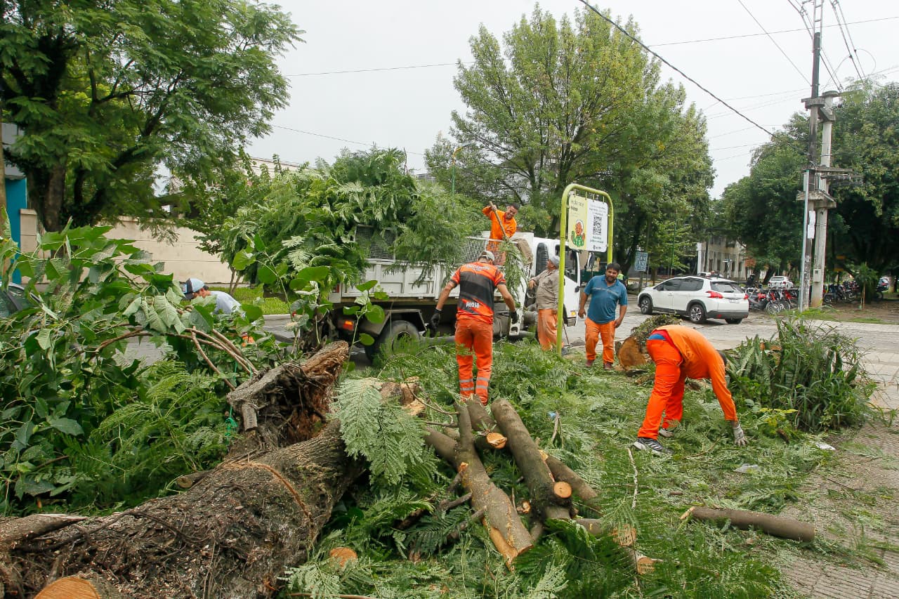 Las tareas se desarrollaron de manera coordinada en diversos sectores. En Villa Obrera se llevaron adelante operativos de barrido, mientras que en calle Mendoza se ejecutaron trabajos de poda a lo largo de más de 100 metros, desde avenida Perú hacia el oeste. Estas intervenciones respondieron a pedidos previos de vecinos y gestiones realizadas a través de la aplicación Nina Bot. Además, se despejaron luminarias para mejorar la visibilidad en la zona, interviniendo ejemplares de tipo “siempre verde”.