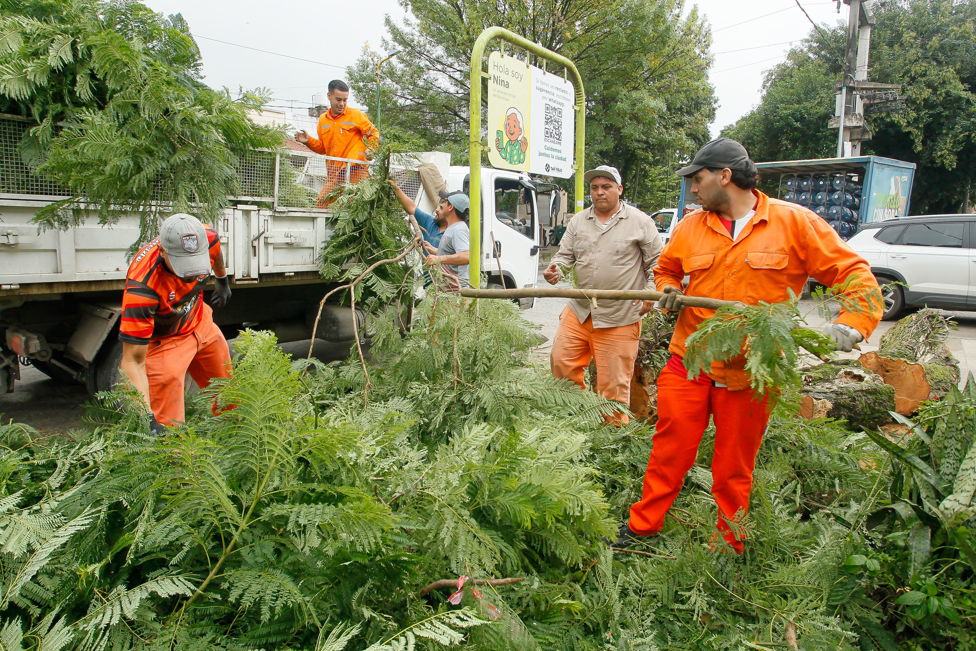 En paralelo, se desarrollan trabajos de poda en Alsina al 200 y en Sáenz Peña al 400, acciones fundamentales para mantener el arbolado urbano en condiciones, prevenir riesgos y favorecer la visibilidad en la vía pública.